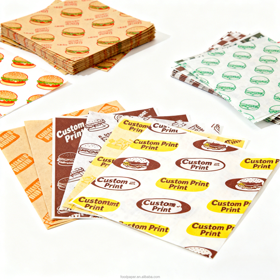 Feuilles de papier enduites de PE jetables, résistantes à la graisse, imprimées avec un logo personnalisé en usine, qualité alimentaire, imperméables, résistantes à l'huile, pour emballer les sandwichs