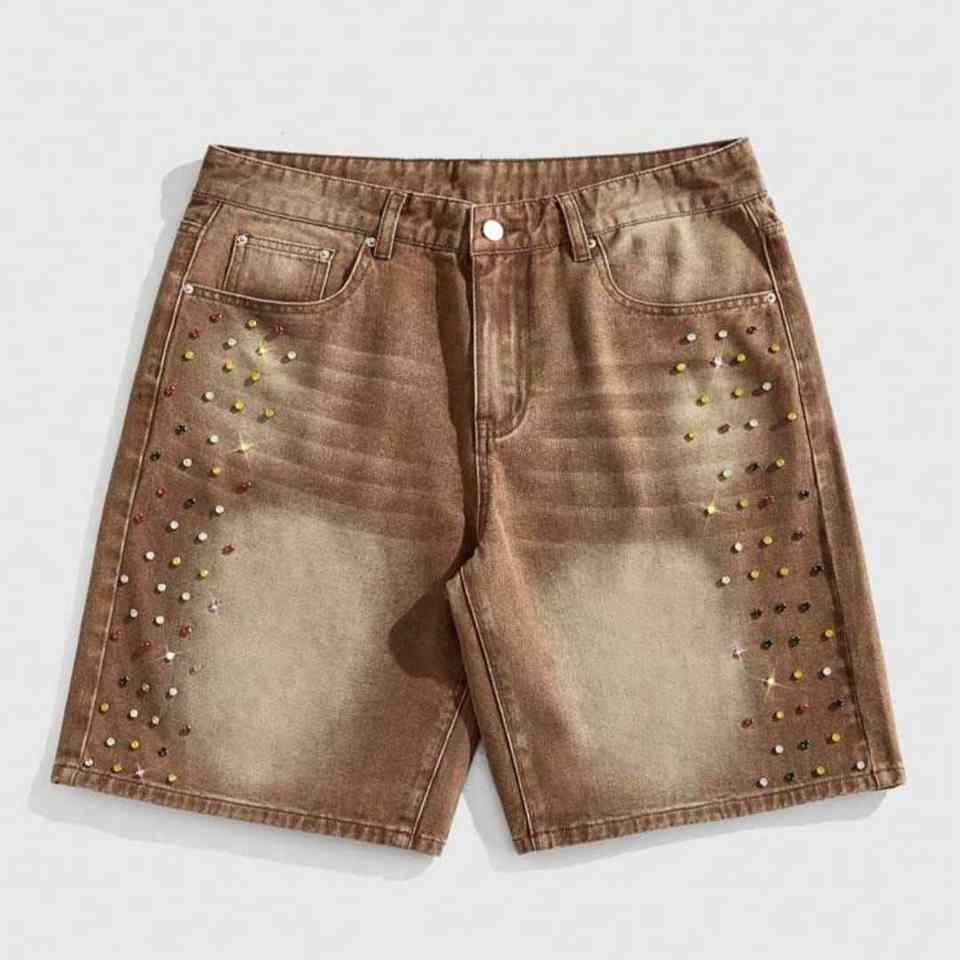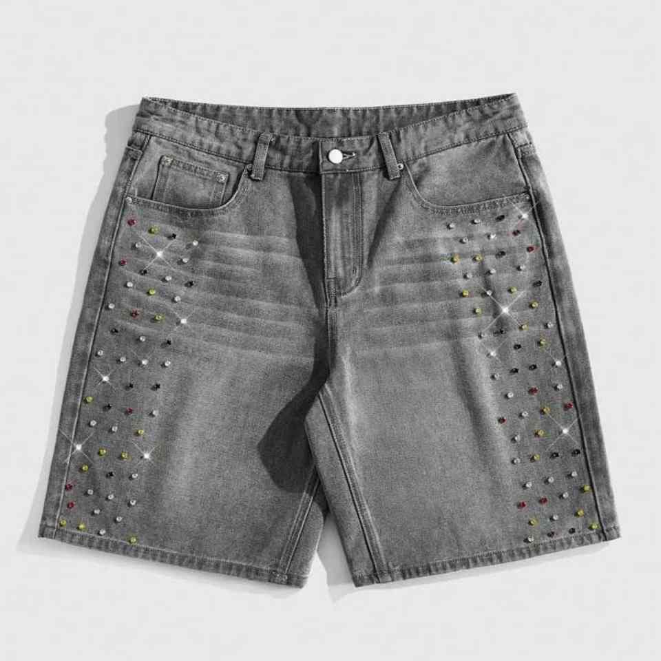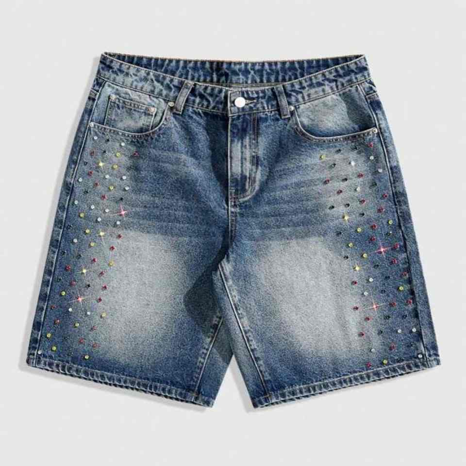 Shorts en jean personnalisés pour hommes, respirants, style vintage streetwear, délavage léger, ourlet brut, avec strass