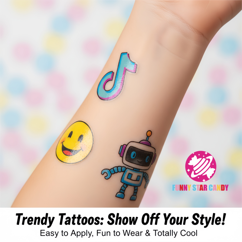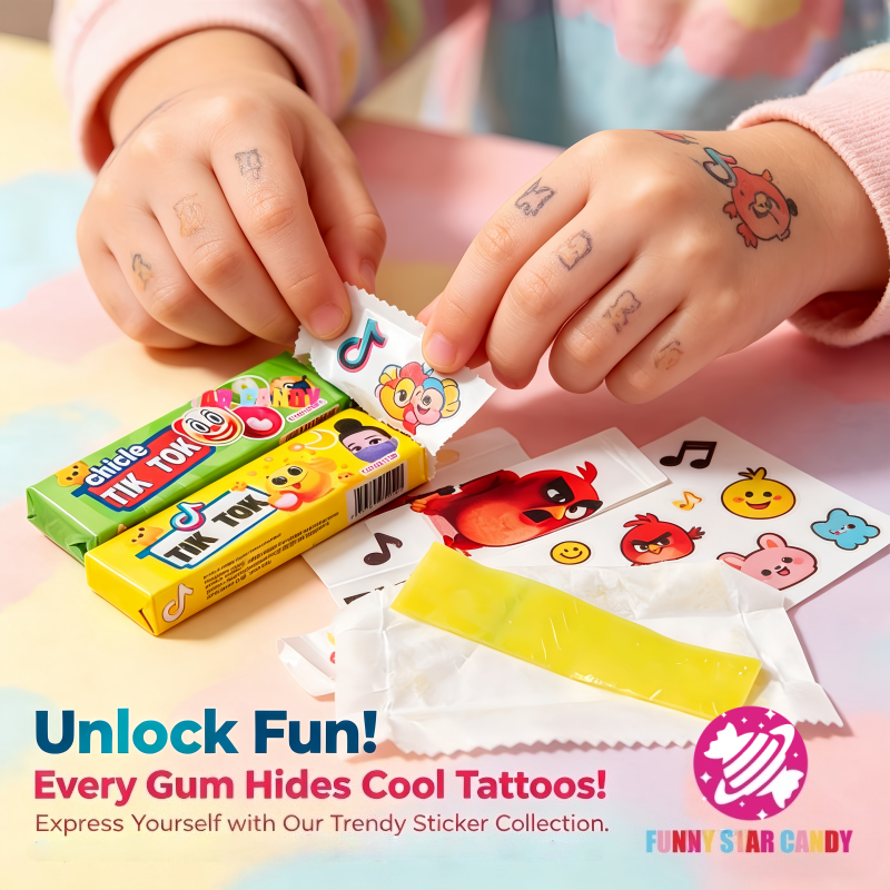 Bonbon de chewing-gum à saveur de fruit avec autocollant de tatouage de dessin animé