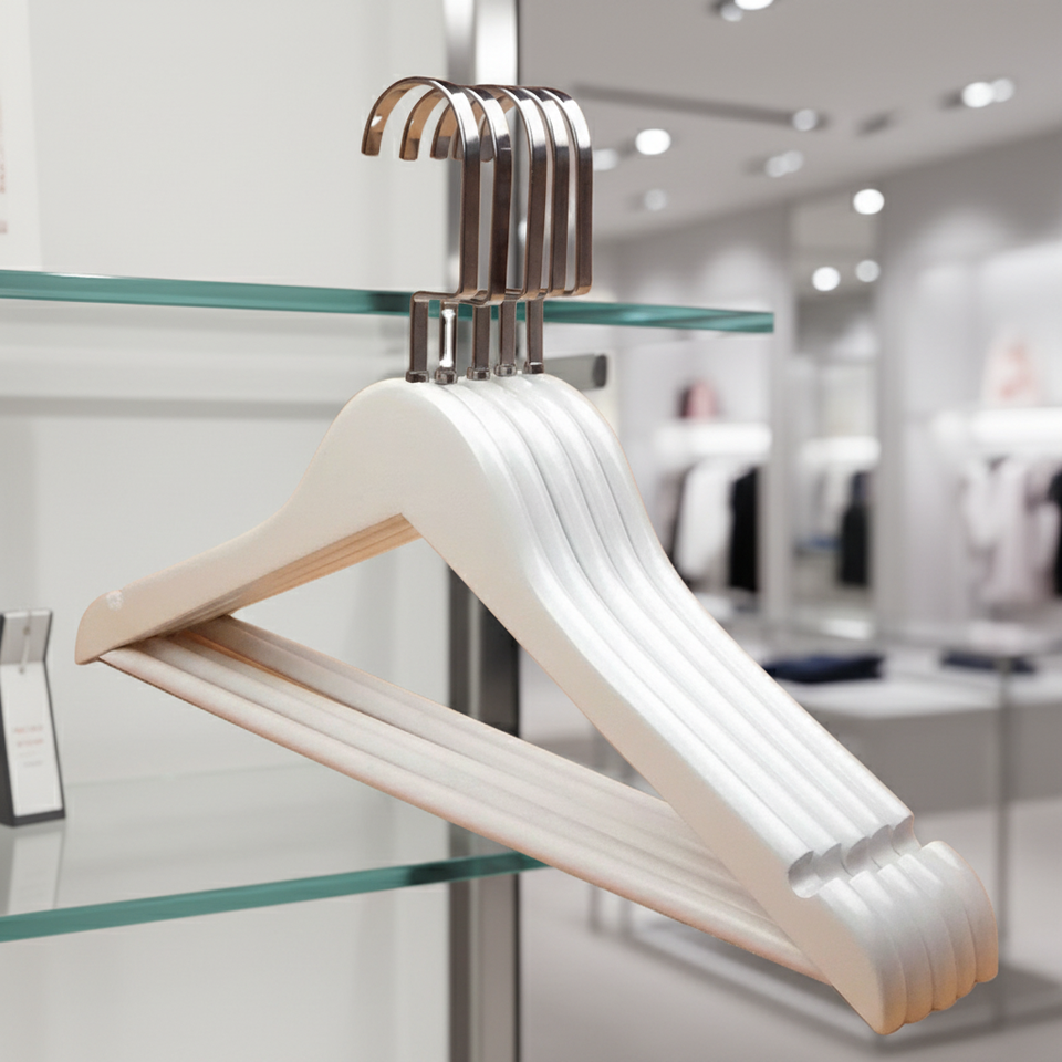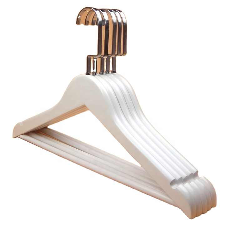 Cintres en bois blancs avec crochet antivol en acier inoxydable, personnalisables en usine, pour vêtements, hôtels, supermarchés et magasins de vêtements