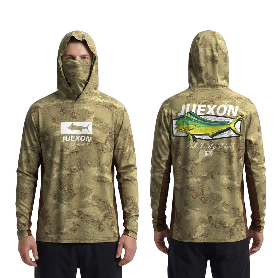 T-shirt à capuche de pêche pour homme grande taille, imprimé camouflage sable Mahi Mahi, personnalisé en usine, avec masque facial UPF50+, imperméable, respirant et anti-humidité
