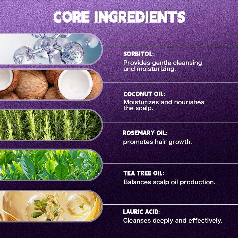 Sorbitol, Saccharose, ACIDE stéarique, Eau, Propylène Glycol, Glycérine, Lauryl sulfate de sodium, CocosNucifera (noix de coco) Huile, Huile d'olive, ACIDE Laurique, Vinaigre de cidre, Huile d'arbre à thé, Romarin 0il, Huile essentielle végétale, Racine de planteMatériel