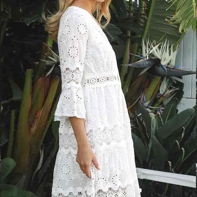 Robe Courte Bohème Élégante Brodé(e) à Col en V et Manches Évasées en Coton Biologique Personnalisable – Conception d'Usine