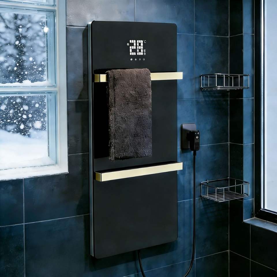 Porte-serviettes chauffant mural moderne en acier inoxydable et pierre frittée, design usine, avec 4 barres, pour salle de bain