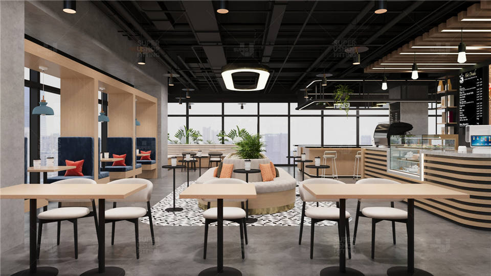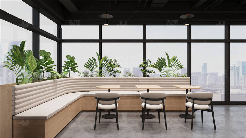 Meubles de restaurant design d'usine, luxe léger, café, sièges incurvés, banquet, banquettes en bois, tables