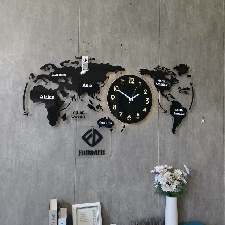 Horloge murale décorative pour la maison, 100x46cm, avec lumière LED nocturne et détecteur de mouvement, directement de l'usine. Possibilité d'ajouter votre pays sur la carte du monde.