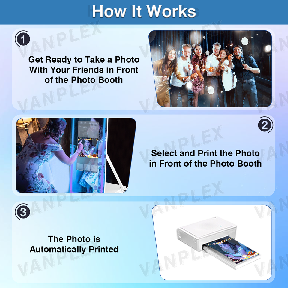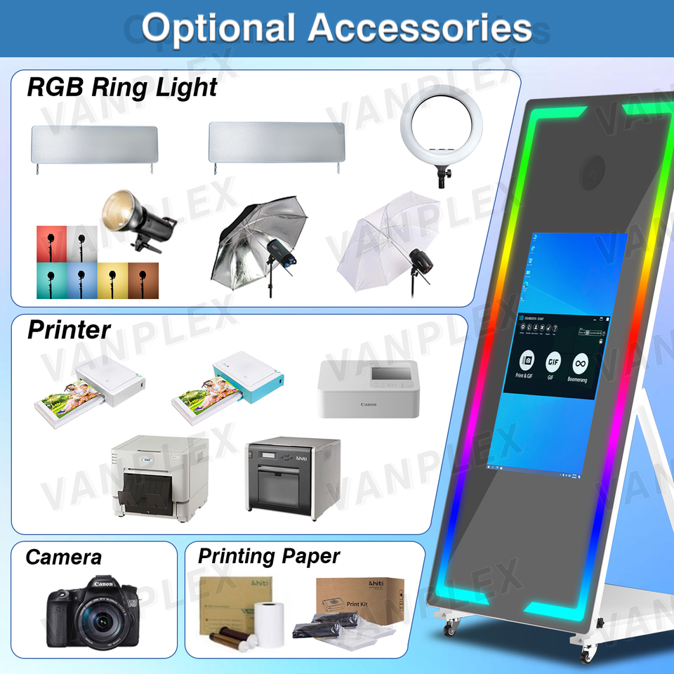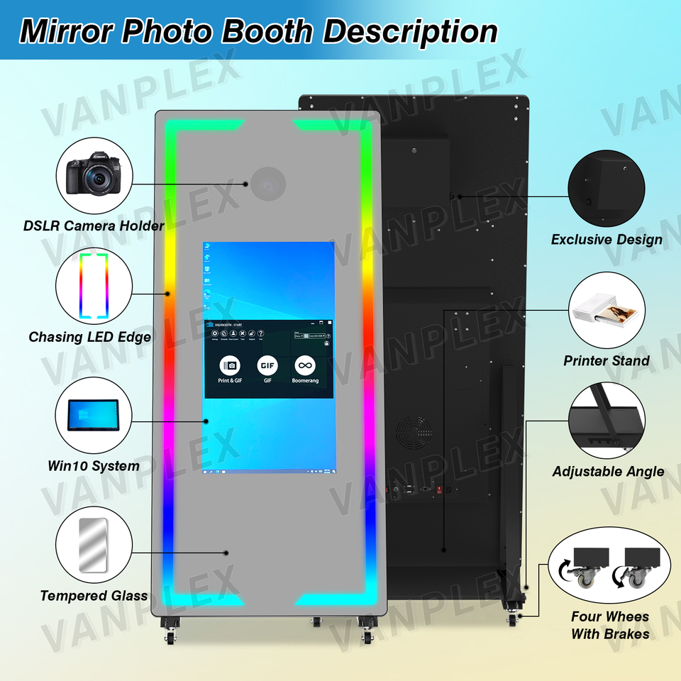 DSLRBooth Mirror Booth 65" – i5 8GB/256GB, compatible avec Canon 1500D et Hiti 525L, 105×46×25–166×46×82 cm, valise incl