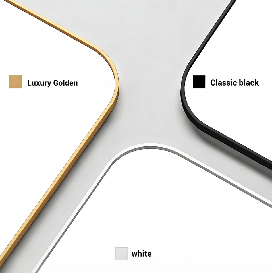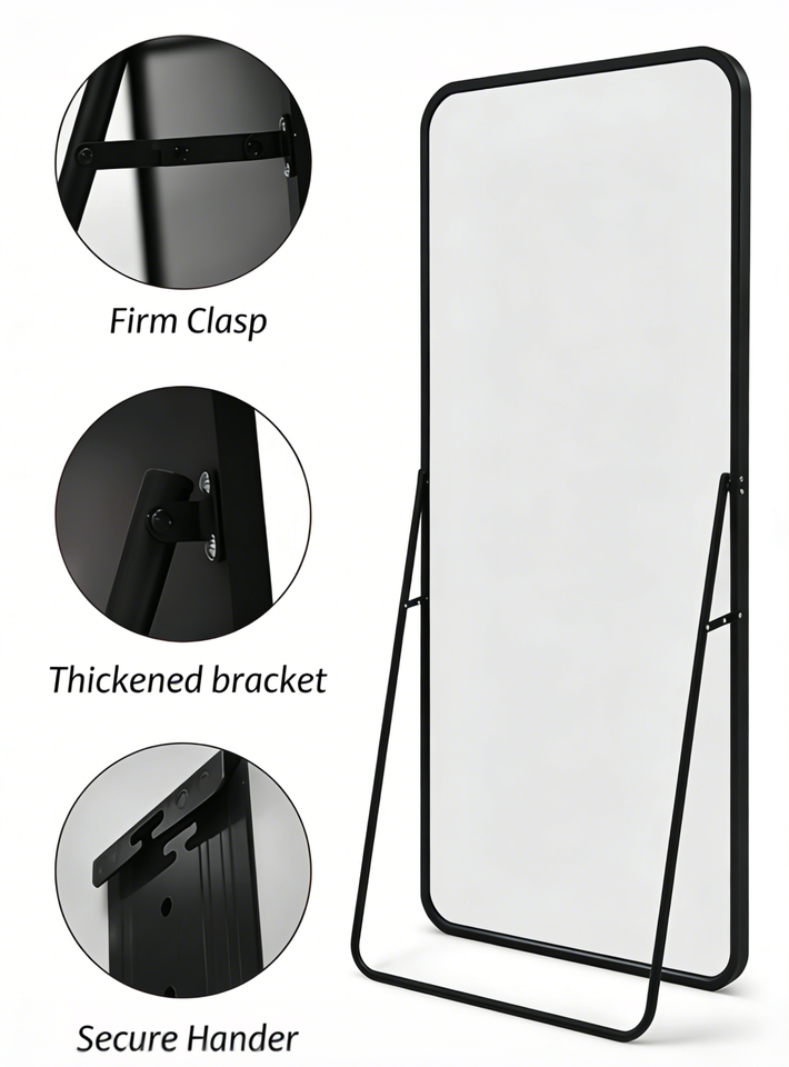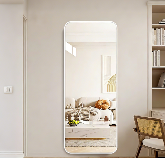 Miroir sur pied/mural contemporain grand format à coins arrondis, cadre en aluminium, verre ultra clair, noir, or, argent, directement de l'usine