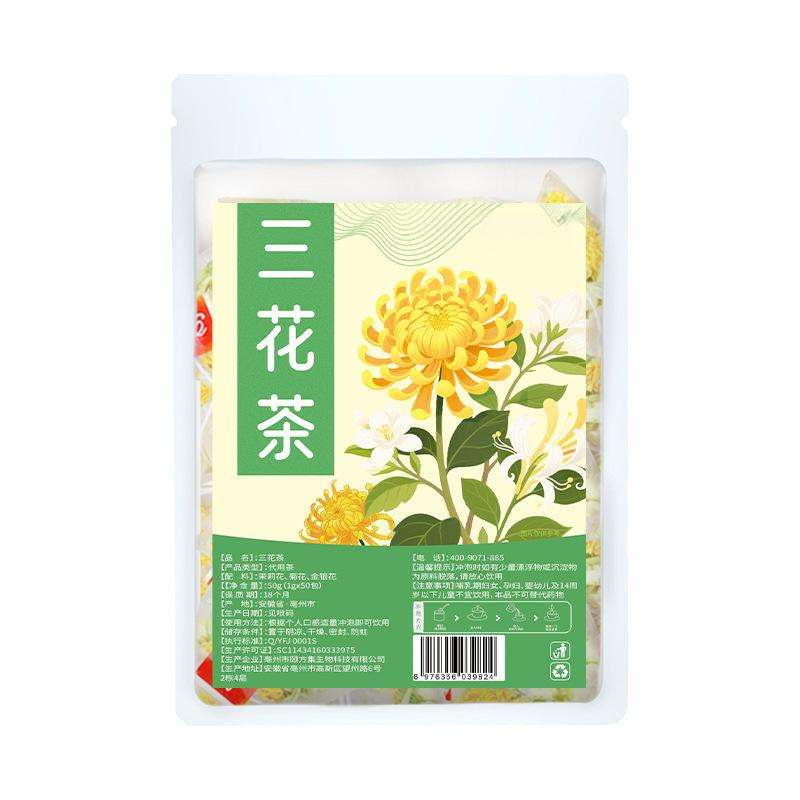 Sachets de thé triangulaires personnalisés à faible MOQ, directement de l'usine, en pure infusion naturelle de trois fleurs : chrysanthème, jasmin et chèvrefeuille