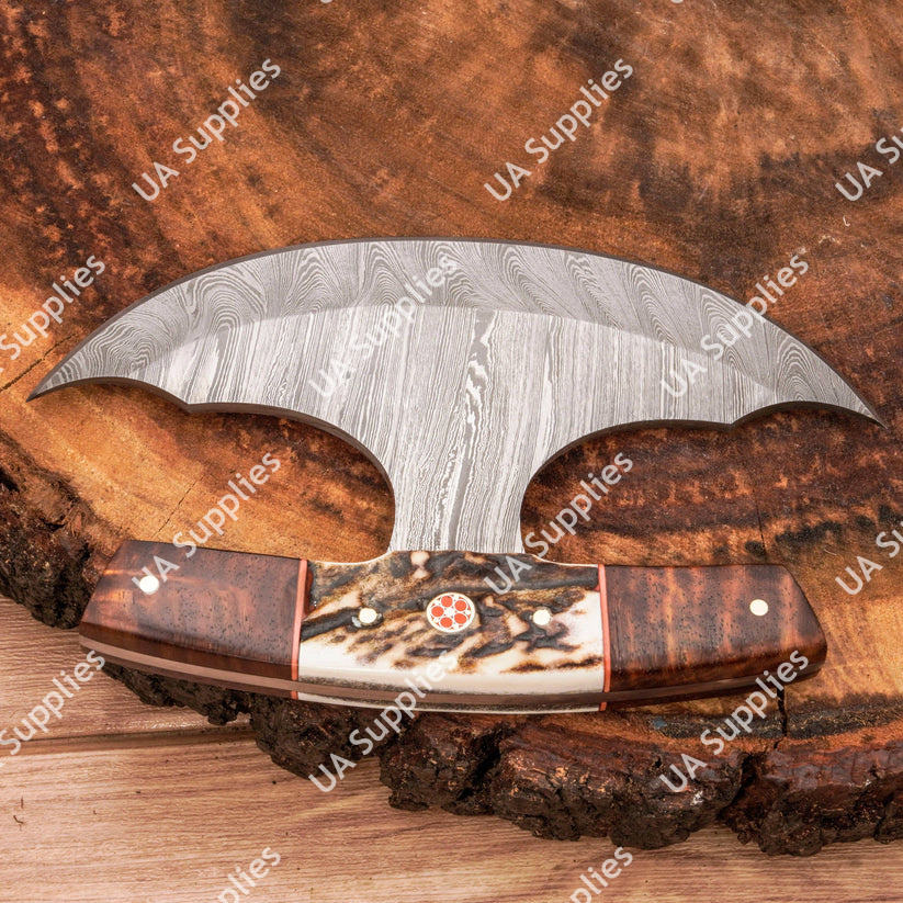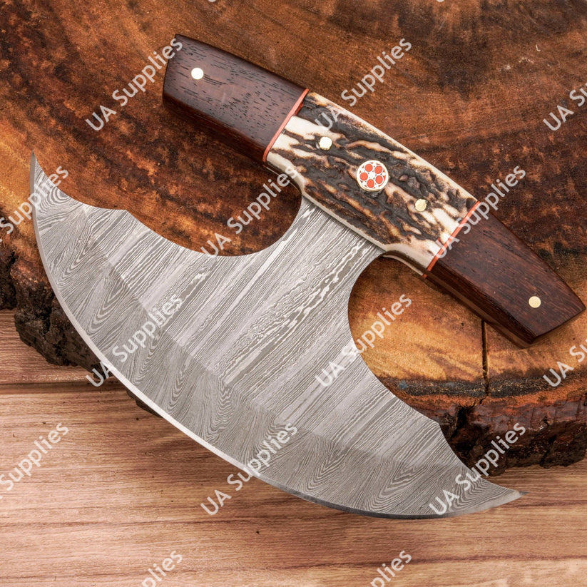 Couteau Ulu personnalisé en acier Damas à lame croissant, manche en bois de cerf, étui en cuir – Idéal pour la cuisine et la découpe – Vente directe usine