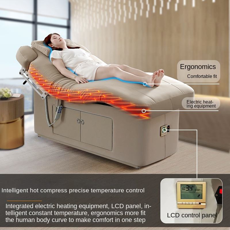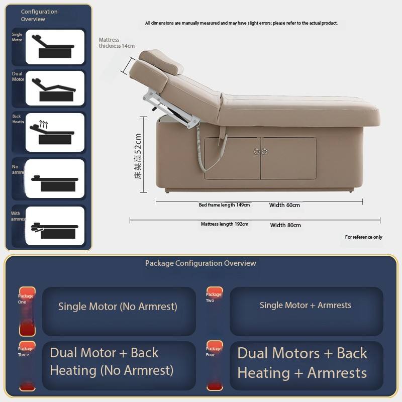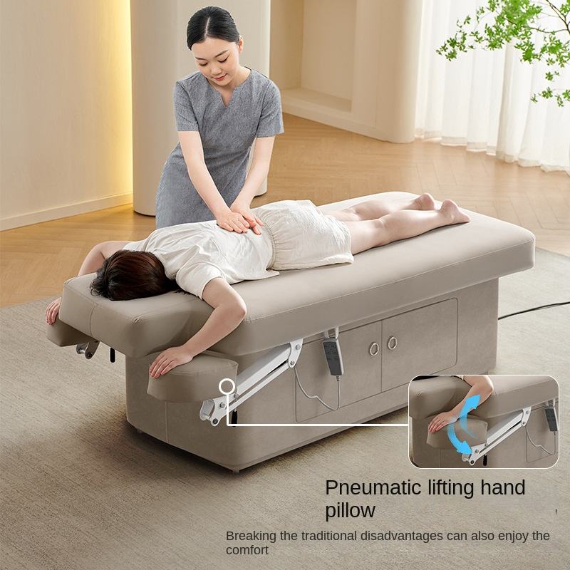 Lit de salon de beauté beige de luxe en vente directe d'usine, 2 moteurs, table de massage électrique, chaise de cosmétique, lit de spa facial