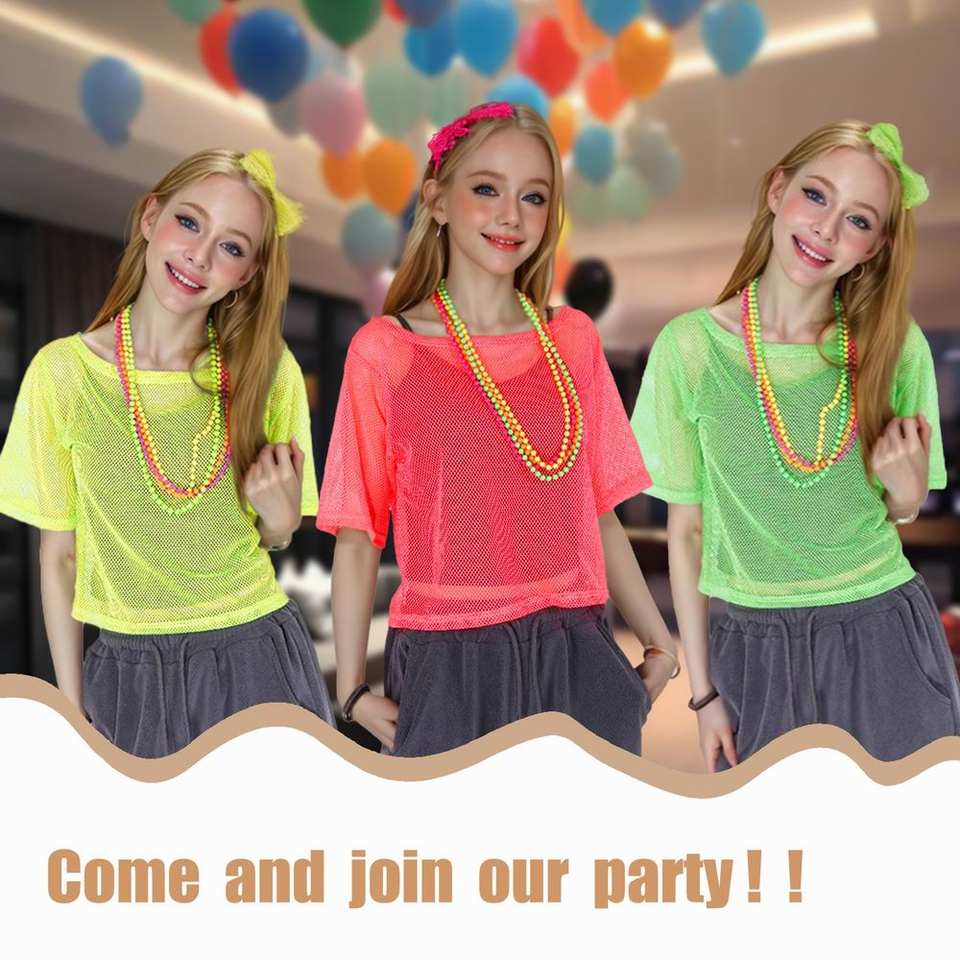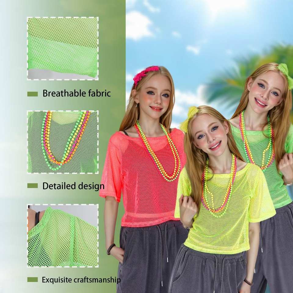 T-shirt de danse rétro années 80 en résille néon pour femme, coupe décontractée en maille douce, haute visibilité, style Mardi Gras/TV/Film, directement de l'usine