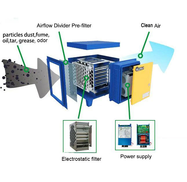 Vente directe d'usine, purificateur d'air pour cuisine commerciale, débit d'air 4000m³/h, filtre ESP, élimination des fumées d'huile, précipitateur électrostatique