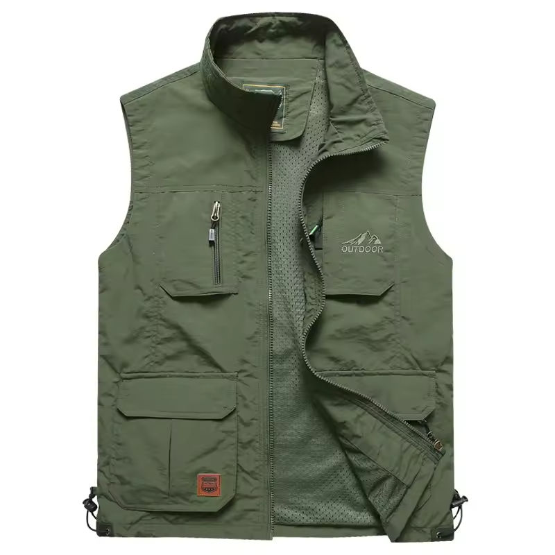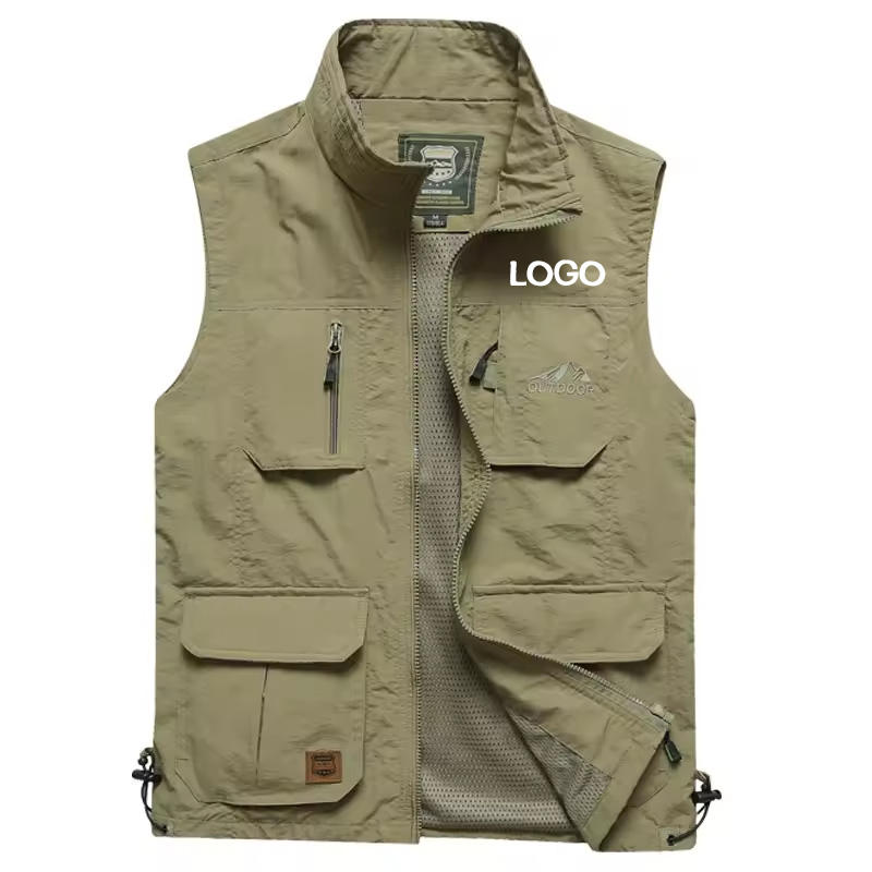 Vente directe d'usine, gilet de pêche décontracté pour homme personnalisé en polyester, gilet respirant multi-poches de haute qualité avec logo