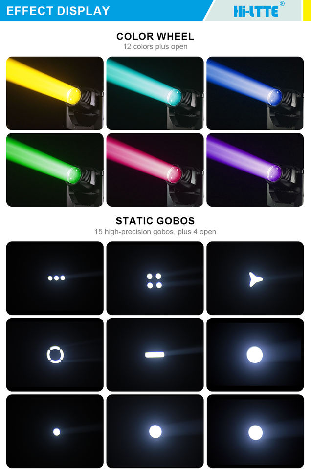 Gobo fixe:15 gobos fixes + 4 ouverts