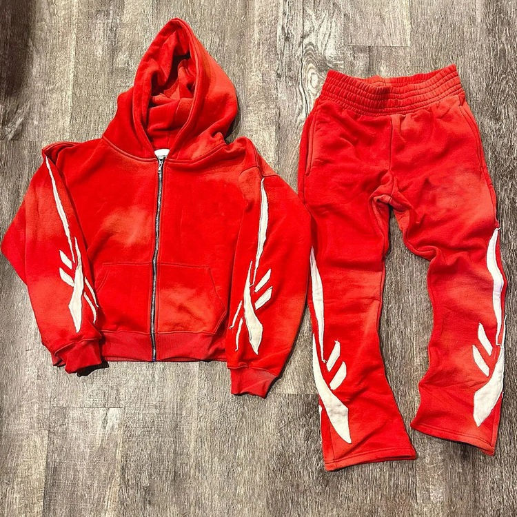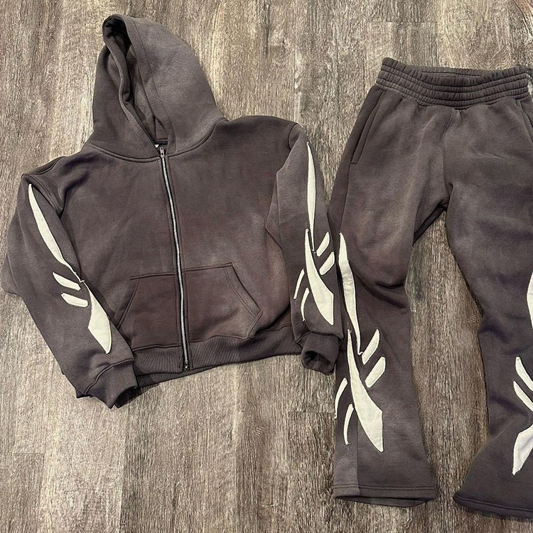 Vente directe usine – Survêtements personnalisés pour hommes avec poches zippées, doublure satinée, broderies effet vieilli, style sweat à capuche et pantalon évasé (OEM)