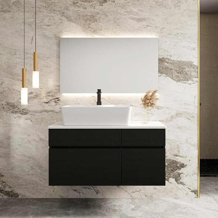 Vente directe d'usine moderne noir flottant salle de bain meuble sous-vasque avec dessus en faux marbre céramique comptoir bassin surélevé bol évier