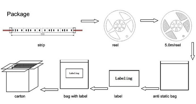5 meter strip in one reel, one reel in one anti-static bag, 25 bags put into one carton,