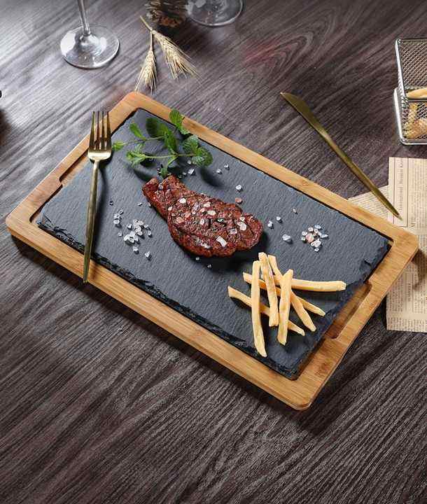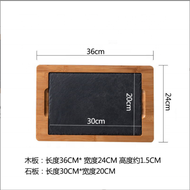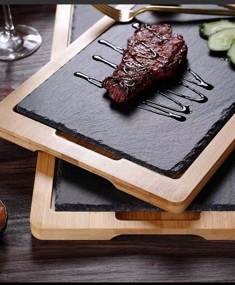 Ventes directes d'usine Vaisselle naturelle Pierre d'ardoise avec assiette en bambou Planche à steak Planche à fromage en bois Assiette en ardoise en bambou
