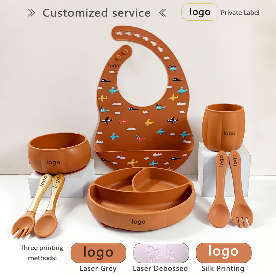 Vente directe usine : Ensemble de vaisselle pour bébé en silicone sans BPA, comprenant une tasse anti-déversement, un bol à soupe à ventouse et un bavoir réglable en taille