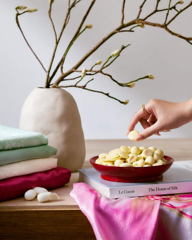 Beurre de cacao, matière sèche du lait, poudre de yaourt