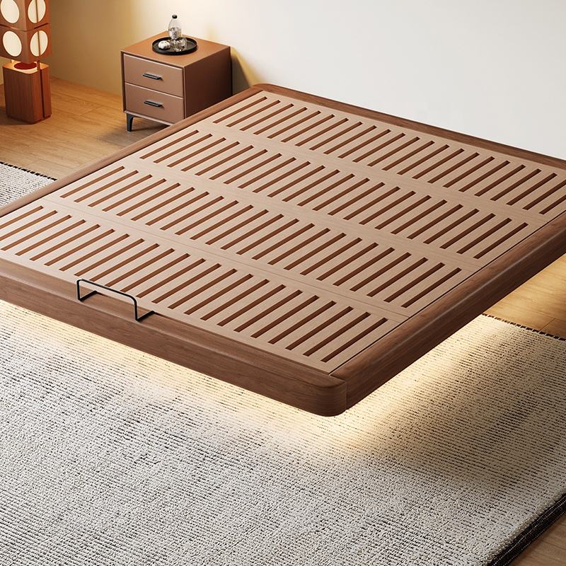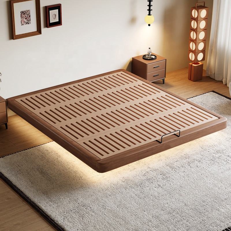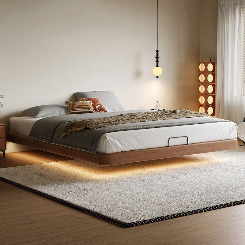 Cadre de lit Queen Size gain de place, directement de l'usine, design flottant sans tête de lit avec lumières LED et ensemble de chambre à coucher de luxe en bois de qualité supérieure