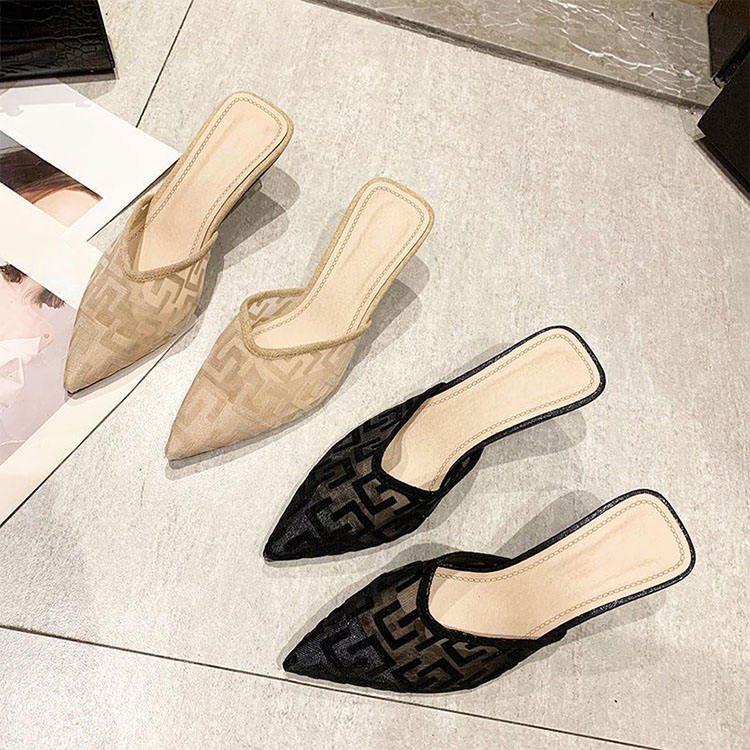 Vente en gros directe d'usine, pantoufles à bout pointu pour femmes, pantoufles en maille, pantoufles sexy à talons hauts, pantoufles d'été