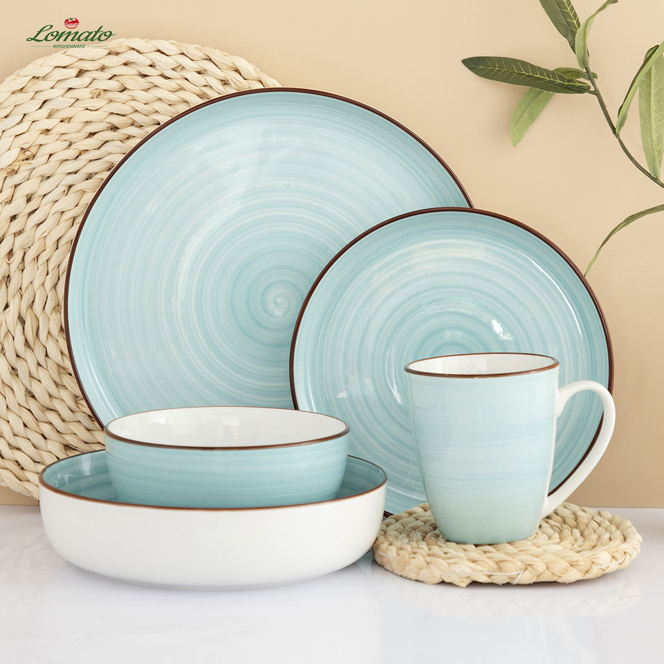 Service de table en céramique peint à la main bleu ciel, directement de l'usine, vaisselle en porcelaine personnalisée pour restaurant et mariage