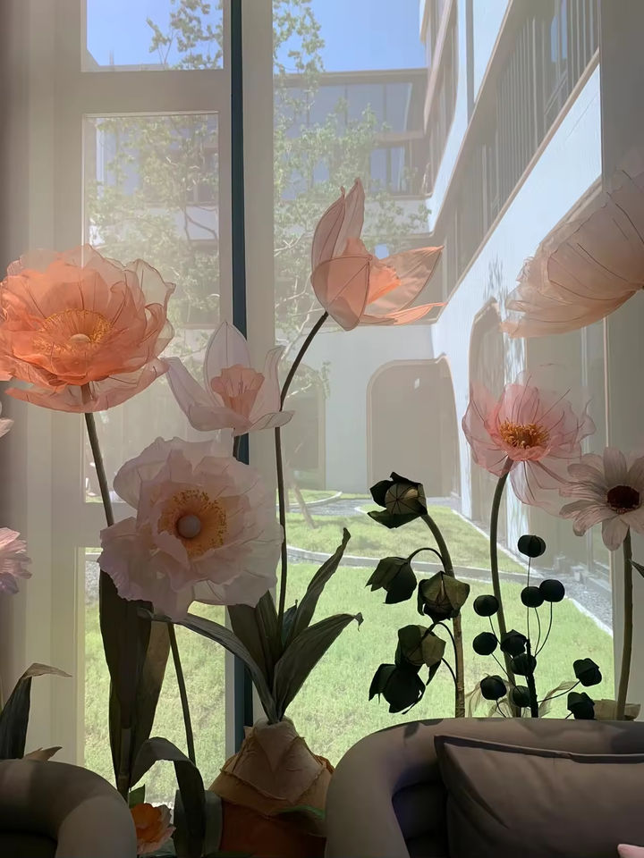 Nom du produit:Fleur de coquelicot en organza géante faite à la main pour la décoration de magasin de fenêtre de mariage