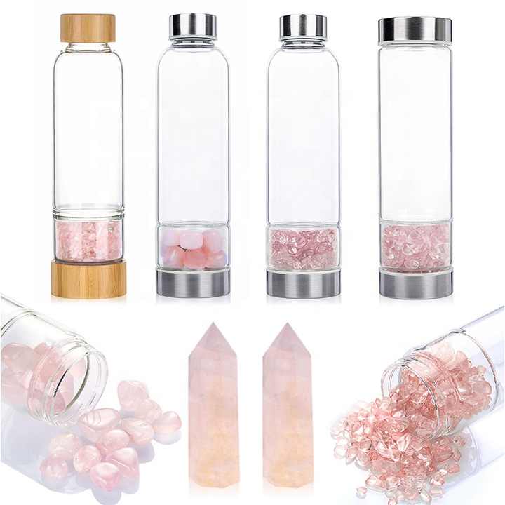 Bouteille d'eau Elixir d'usine pour la guérison par les pierres précieuses, bouteille d'eau en verre avec des copeaux de quartz rose, bouteille d'eau en cristal