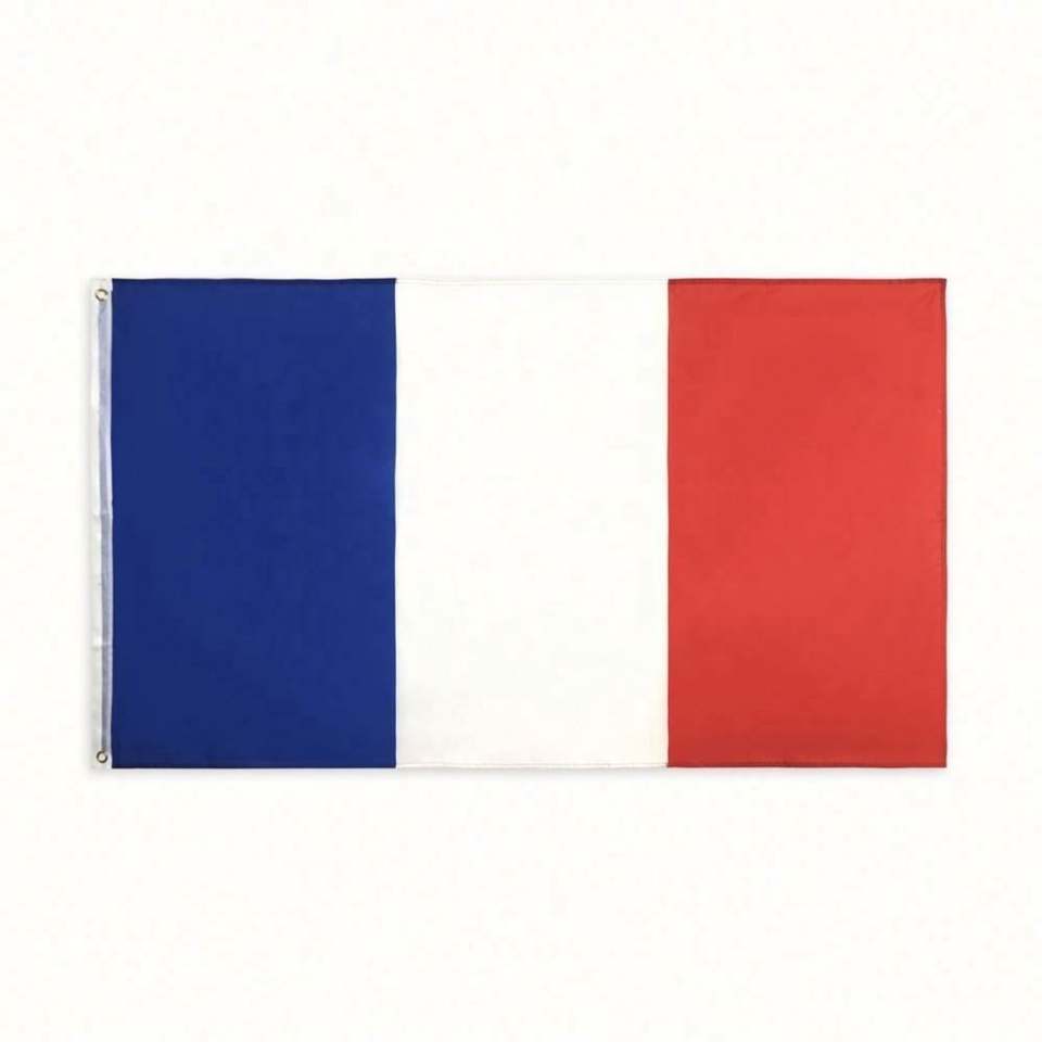 Drapeau de France personnalisé, imperméable, 100% polyester, rouge, blanc et bleu.