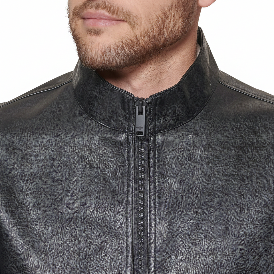 Veste de motard en cuir véritable fabriquée en usine, coupe ajustée, col montant, logo sur le devant, vêtement d'hiver pour homme, couleur et tailles personnalisées