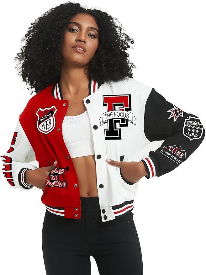 Fabricant d'usine de vestes universitaires pour femmes, vestes de baseball personnalisées pour femmes, vestes universitaires personnalisées en gros, hauts courts pour femmes vierges