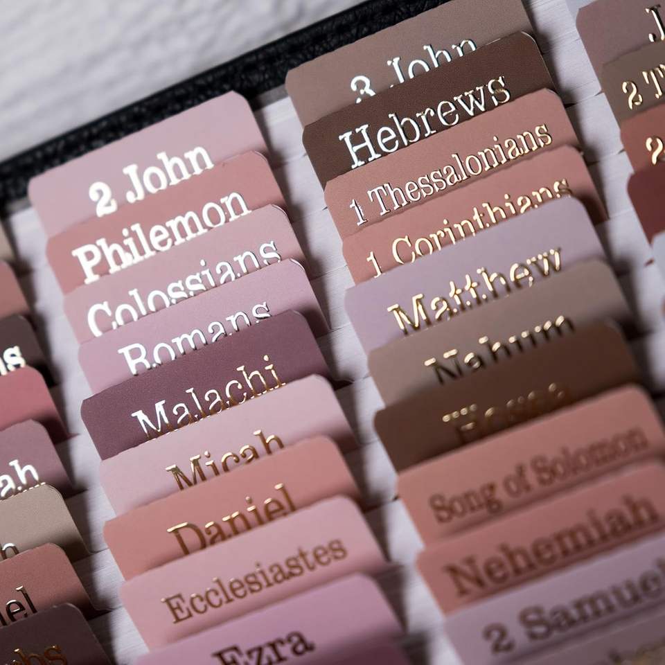 Autocollants catholiques chrétiens roses OEM d'usine, onglet biblique de lettrage en relief de feuille d'or personnalisée avec résumé de livre
