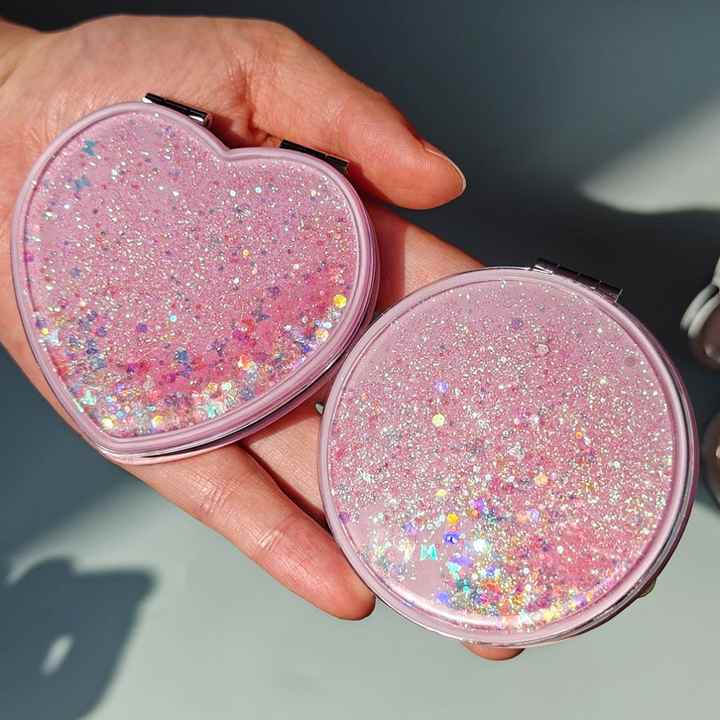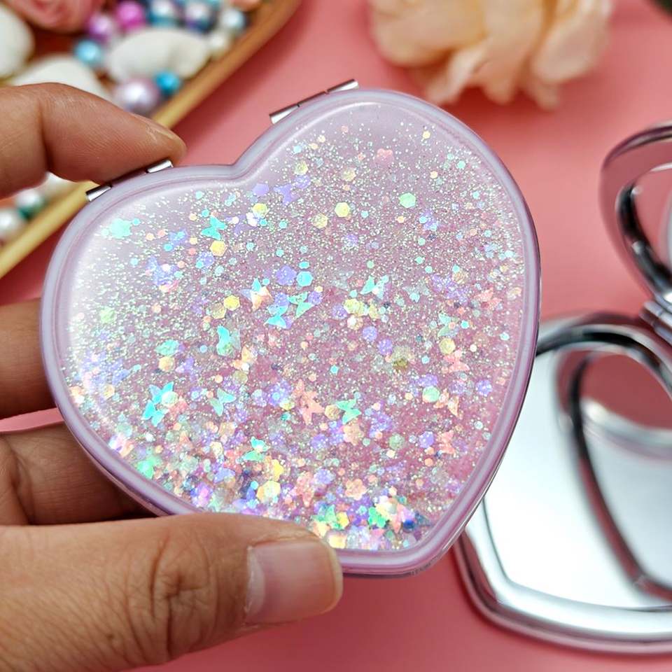 Miroir de poche pliable double face à paillettes en forme de cœur, effet sable mouvant liquide brillant, OEM d'usine