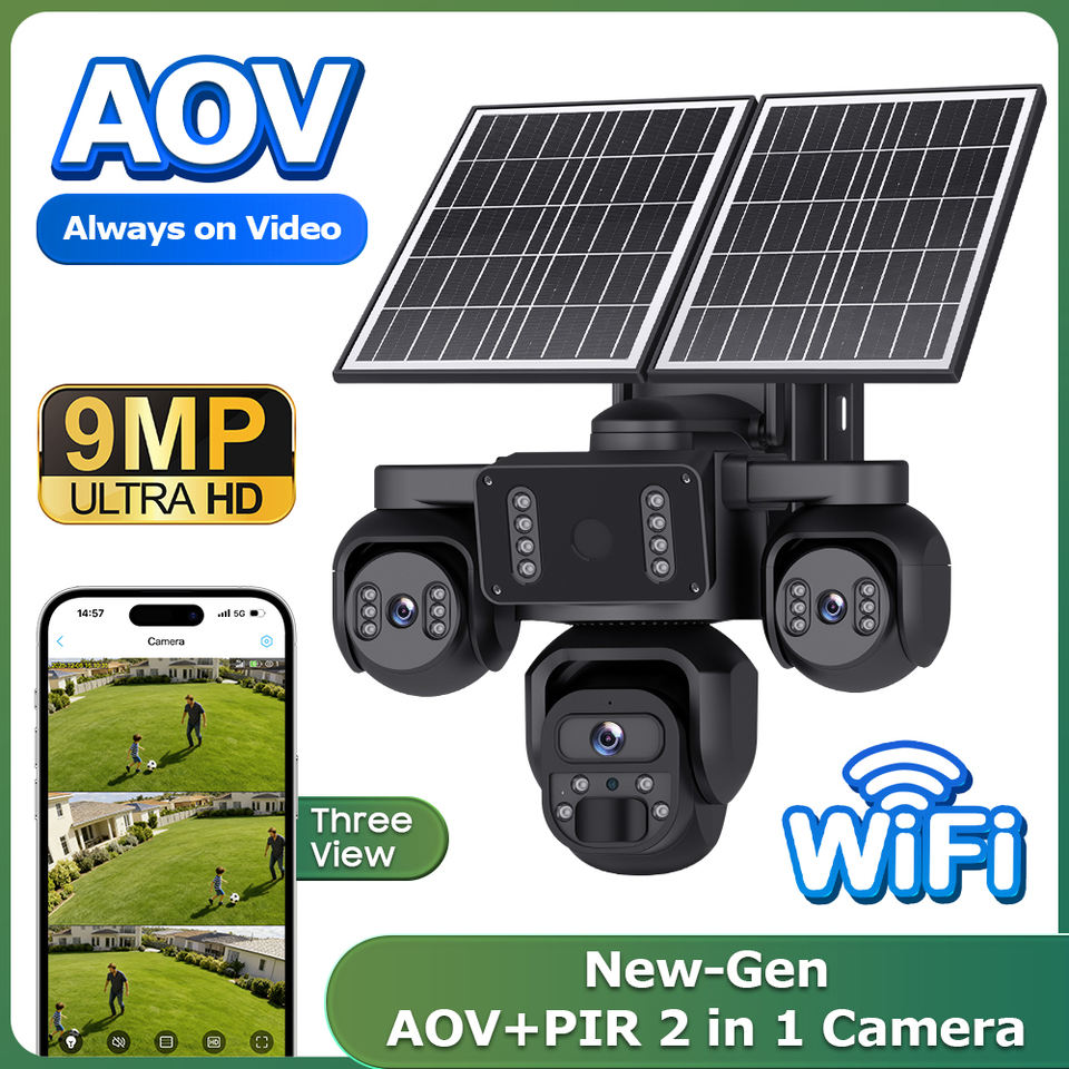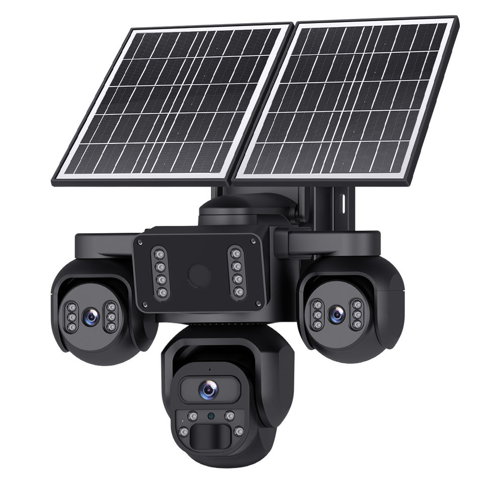 Système de surveillance de sécurité à faible consommation d'énergie avec caméra solaire 4G à 3 objectifs et écran partagé en 3 parties, enregistrement vidéo 24h/24, prix d'usine