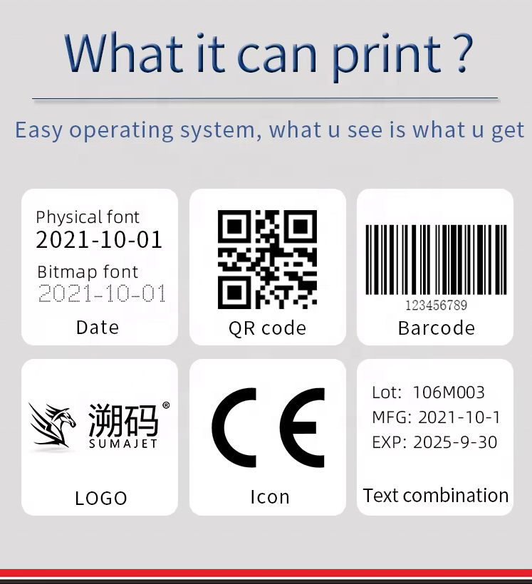 Contenu d'impression:Code de QR, code de barde, code de DM, date, heure, numéro de série etc