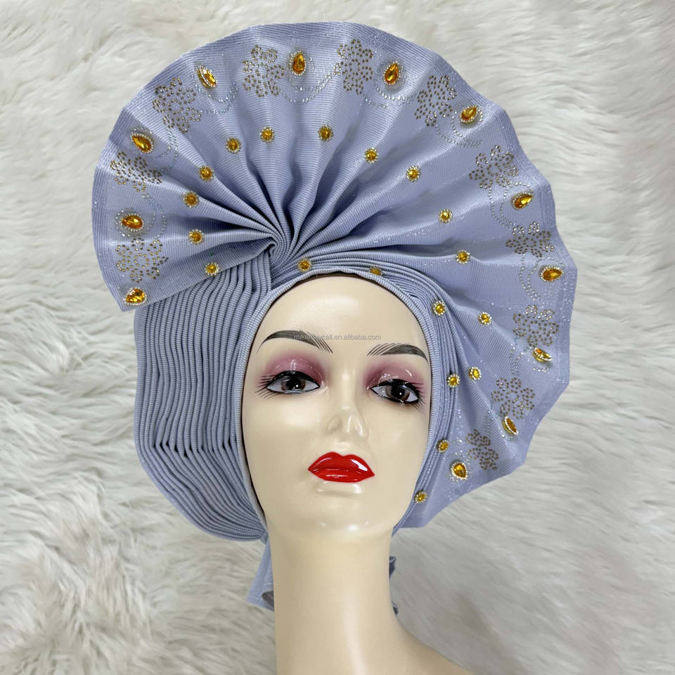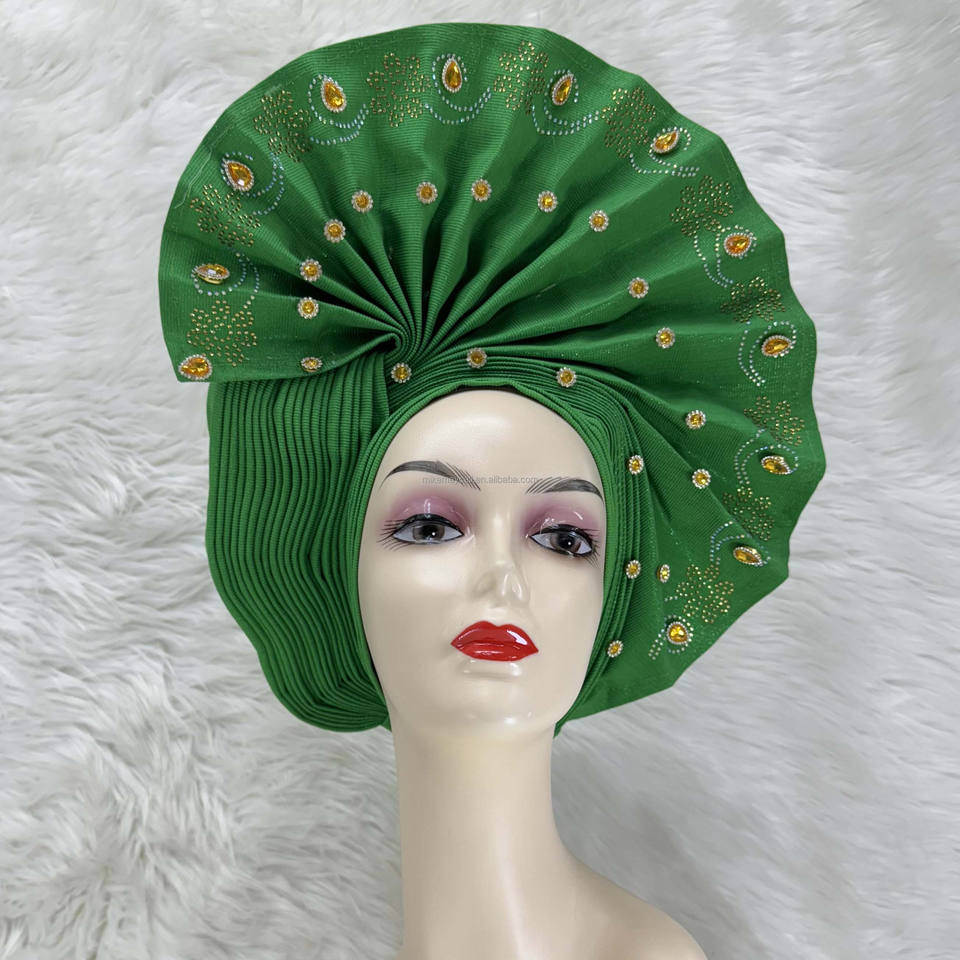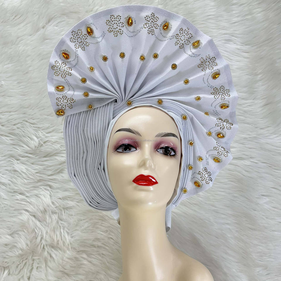 Prix usine perlé femmes rouge Auto Gele fête africaine Headtie Aso Oke avec des pierres pour la fête de désherbage
