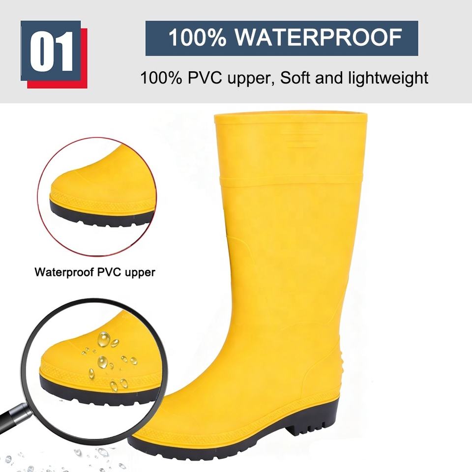 Bottes de pluie en PVC jaunes légères, antidérapantes, résistantes aux produits chimiques et à l'huile, non sécurisées, hauteur genou, avec logo, prix d'usine, certifiées CE