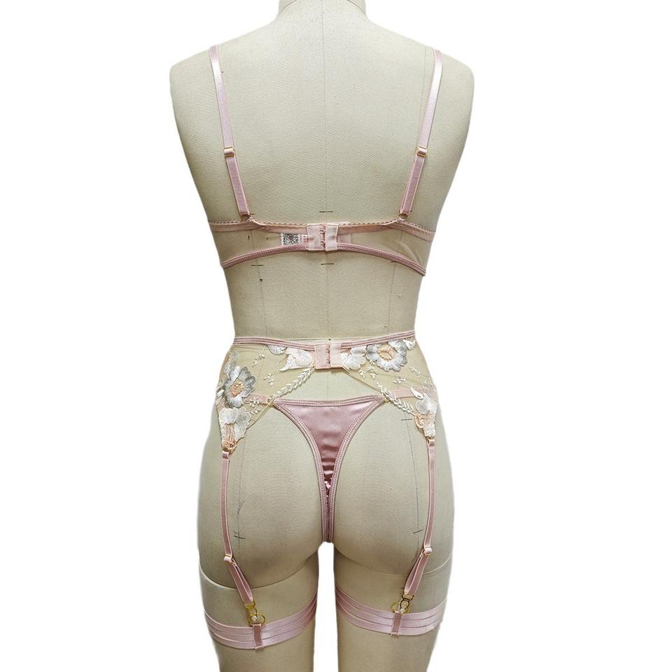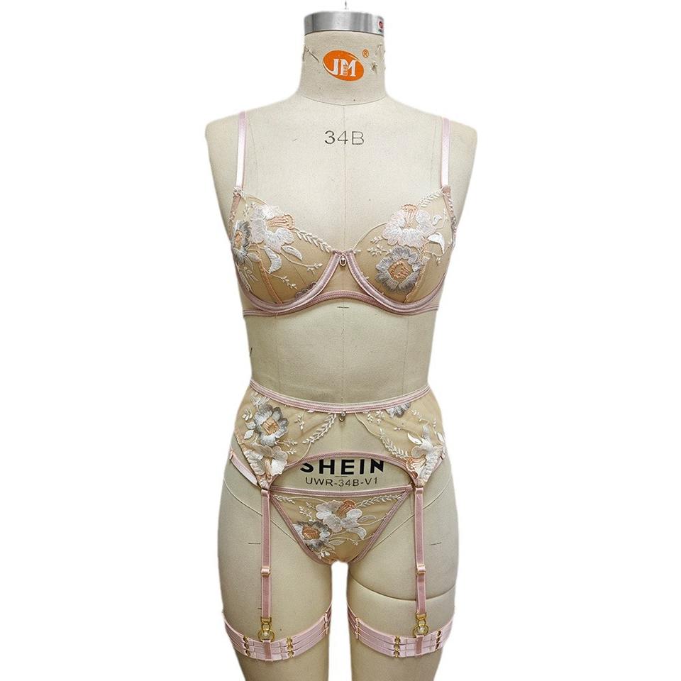 Prix usine Floral avec porte-jarretelles et bas dentelle brodée ensembles Lingerie Sexy chaud Transparent pour femme