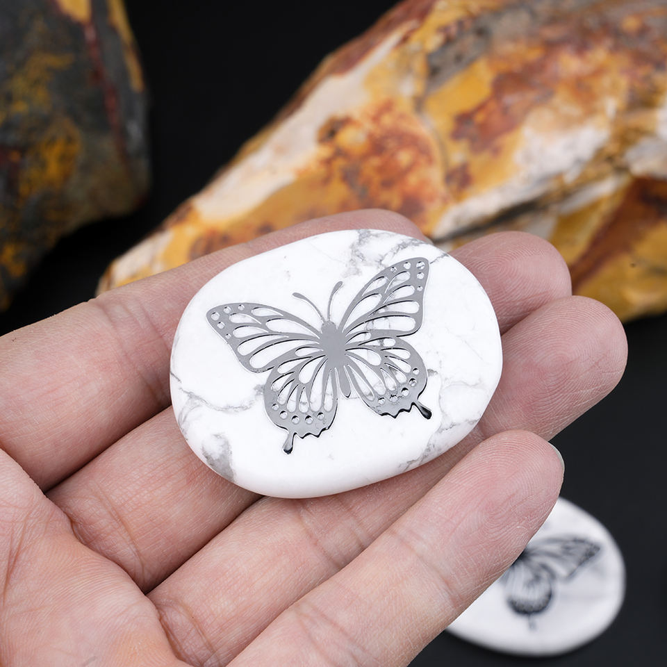 Prix usine pierre précieuse howlite blanche pierre papillon motif de transfert UV pierre totem