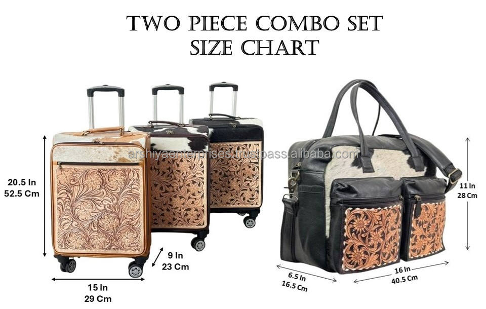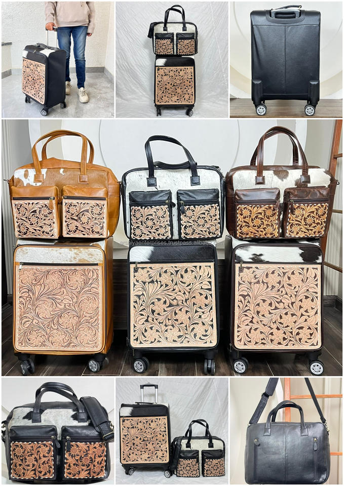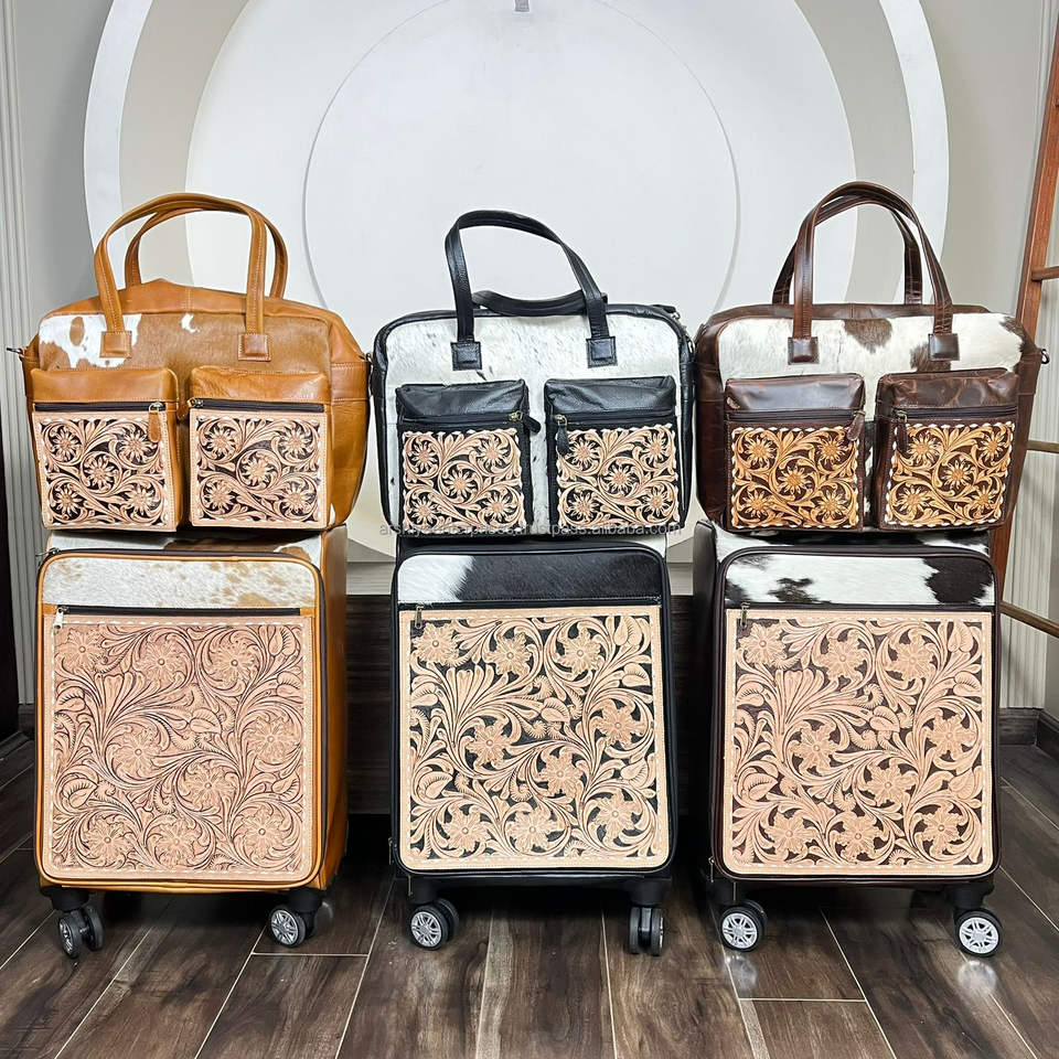 Prix d'usine, haute qualité, ensemble de voyage deux pièces en cuir de vachette fait main, sac à roulettes et sac à couches assortis, style western