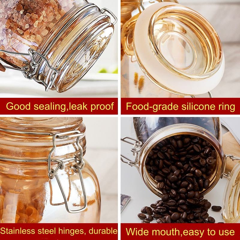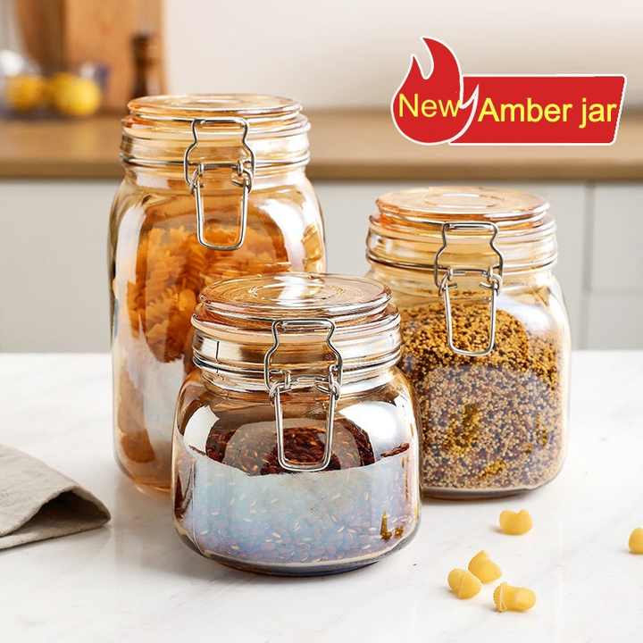 Prix d'usine, pot de conservation en verre à large ouverture, 500 ml, 750 ml, 1000 ml, 1500 ml, pots en verre ambré ronds avec couvercle à verrouillage pour cornichons, céréales, aliments