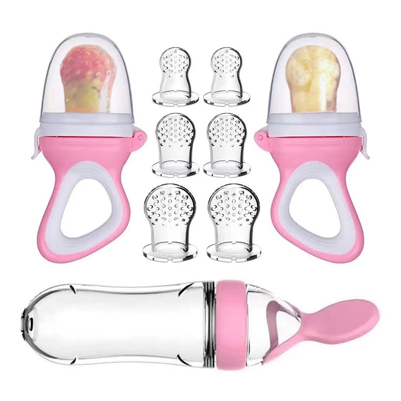 Stocks d'usine, sucette pour bébé en silicone de qualité alimentaire sans BPA, ensemble avec biberon à presser et cuillère pour bébés de 6 à 12 mois