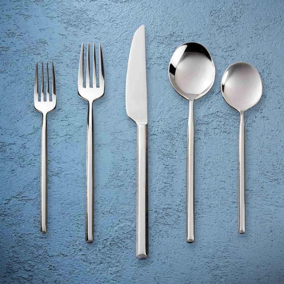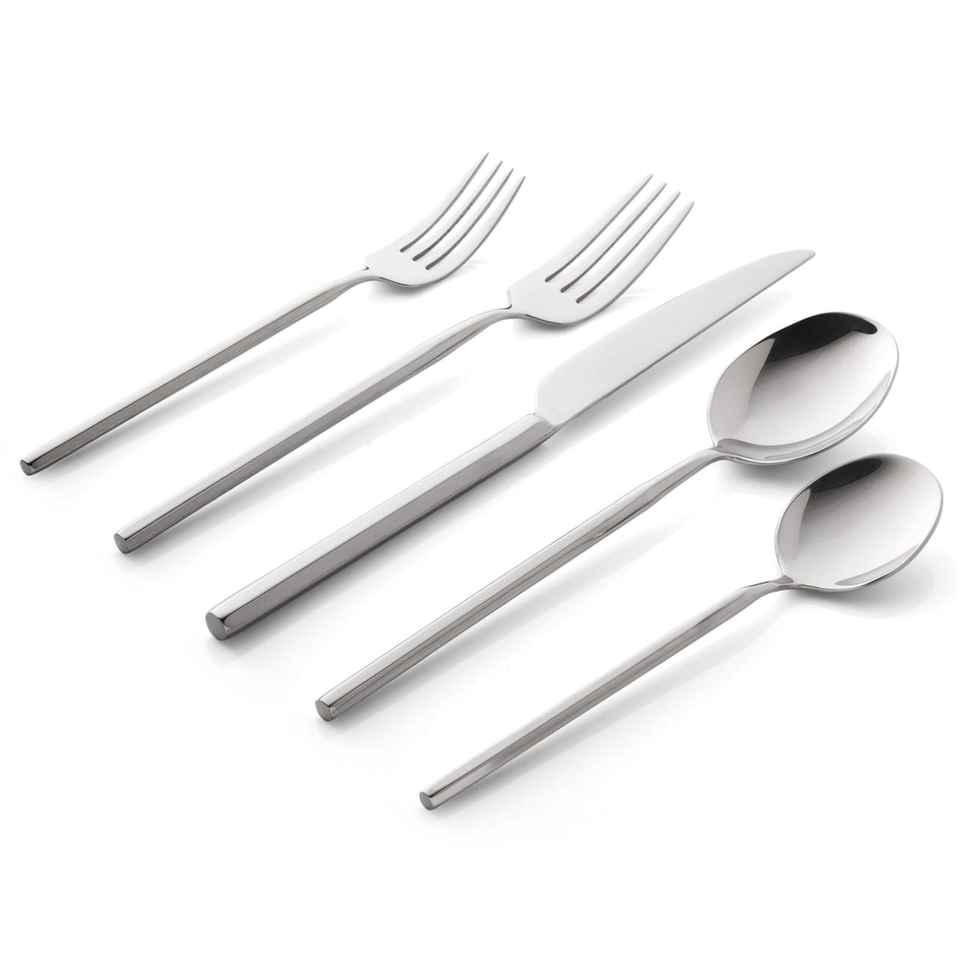 Ensemble de couverts en acier inoxydable de cinq pièces avec manche design, qualité supérieure, design moderne, compatible lave-vaisselle, fourni par l'usine