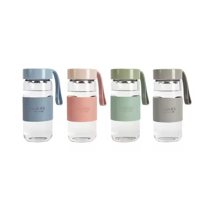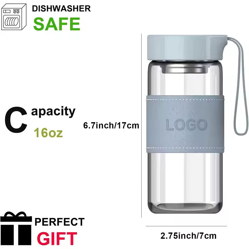 Bouteille d'eau en verre borosilicate de 480 ml (16 oz) avec infuseur à thé et étui en cuir, personnalisable avec logo – Vente en gros usine