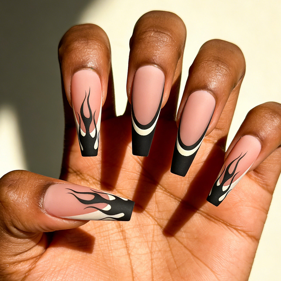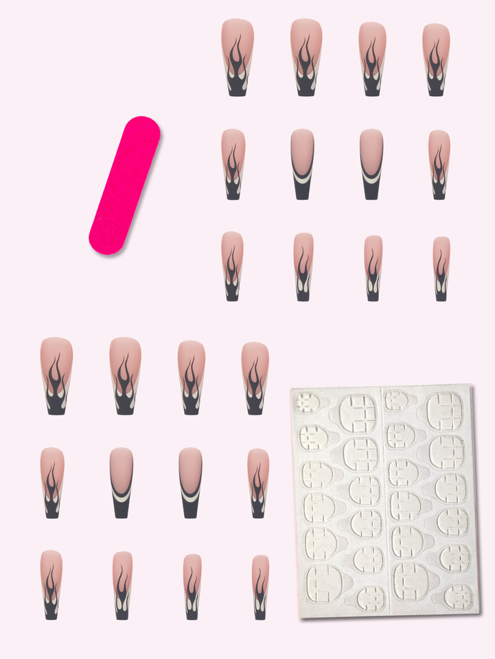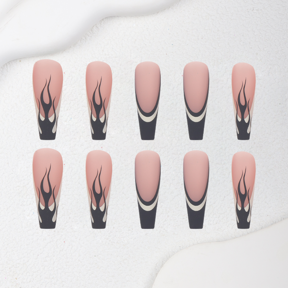 Vente en gros usine – 24 faux ongles ABS de haute qualité, faciles à poser, motif flamme noire, style French long ballet, finition mate