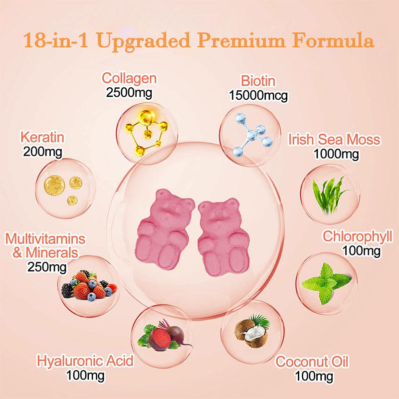 Main Ingredient:Total Carbohydrate, Total Sugars, Collagen, Biotin, Irish Sea Moss, Keratin, Chlorophyll, Coconut oil, Hyaluronic Acid, Pantothenic Acid, Folate, Vitamin A, Vitamin B6, Vitamin B12, Vitamin C, Vitamin D, Vitamin E, Iodine, Zinc, Sodium