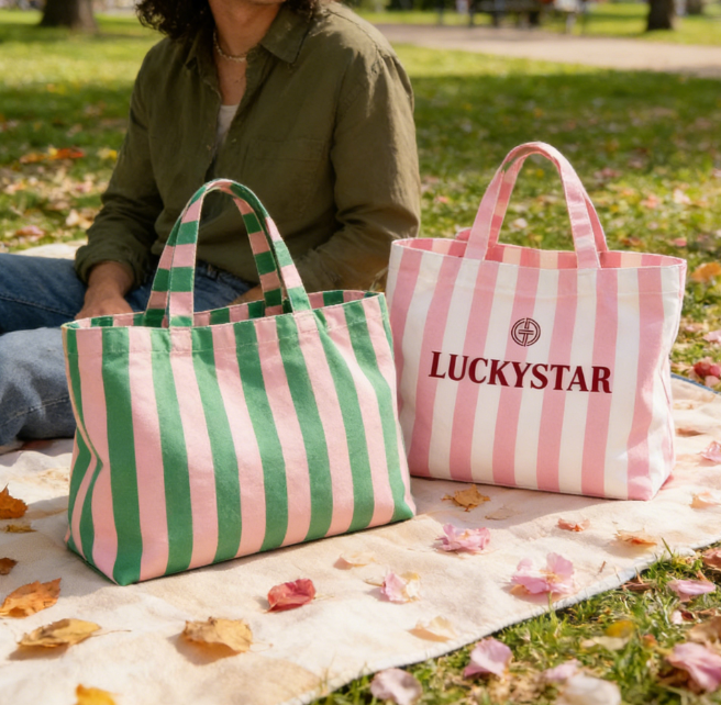 Sac fourre-tout en toile de coton rose et jaune, grand format, avec logo rayé personnalisé, idéal pour le shopping, les courses ou les week-ends – Vente en gros usine