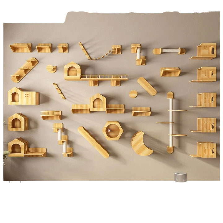 Arbre à chat en bois moderne personnalisé en gros d'usine avec hamac étagères murales écologiques et emballage en carton pour une utilisation en intérieur